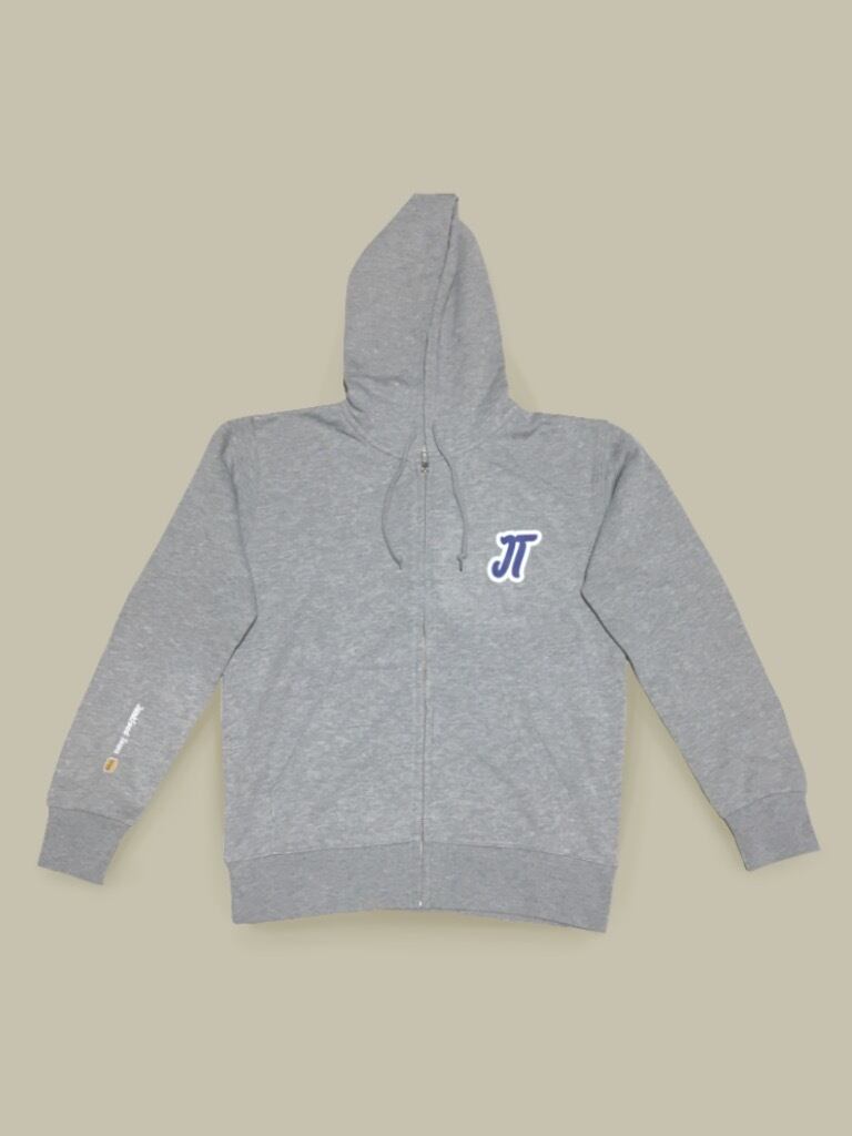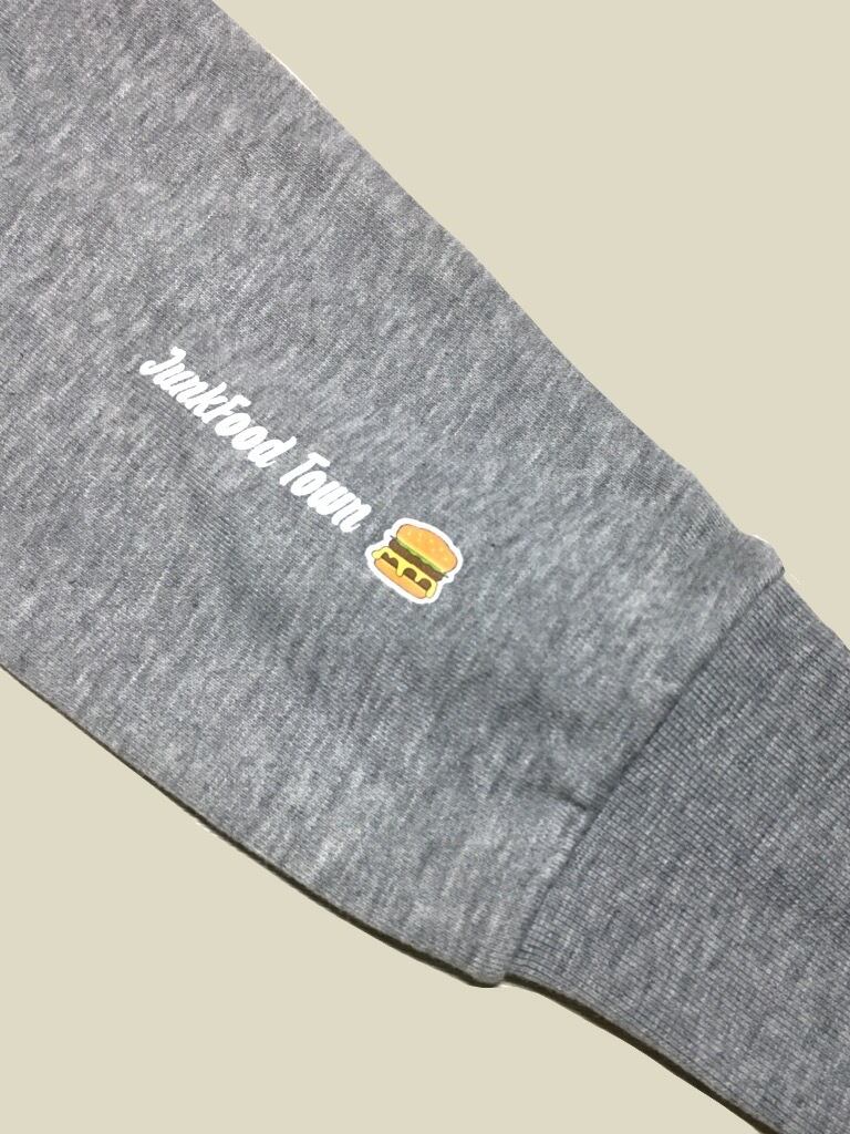ワッペン風の大きめロゴとハンバーガー& JunkFood Townの文字をプリントしたジップパーカーです。